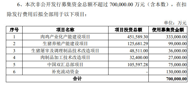 对于本次定增,双汇发展表示,2018年下半年以来,非洲猪瘟防控形势严峻,生猪产能大幅下滑,生猪供给大幅减少,造成猪价肉价高企;与此同时,在非洲猪瘟等多重因素叠加影响下,其他肉类,尤其是鸡肉替代需求增加,引致相关产品市场波动加大,从而对居民肉类消费造成不利影响。公司作为中国肉类行业的龙头企业,进一步扩大发展养殖业,一方面能够完善企业肉类产业链,增强抗风险能力和综合竞争力,另一方面也是企业发挥龙头带动作用,积极履行社会责任的具体举措。