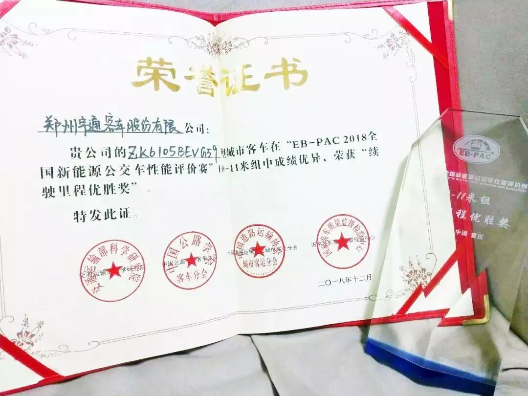 2018年12月1日,在重庆举办的“EB-PAC 2018全国新能源公交车性能评价赛”结果揭晓,宇通客车的两款参赛车型ZK6105BEVG59和ZK6125BEVG59E,一举分别斩获10-11米组和11-12米组的“全能奖”、“节能优胜奖”、“续航里程优胜奖”、“动力性能优胜奖”共8项大奖,囊括了此次性能评价赛设置的所有8个组别的奖项,实现“大满贯”!